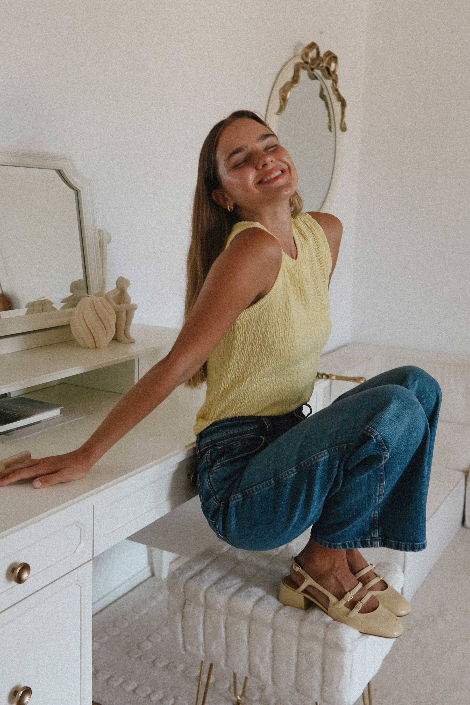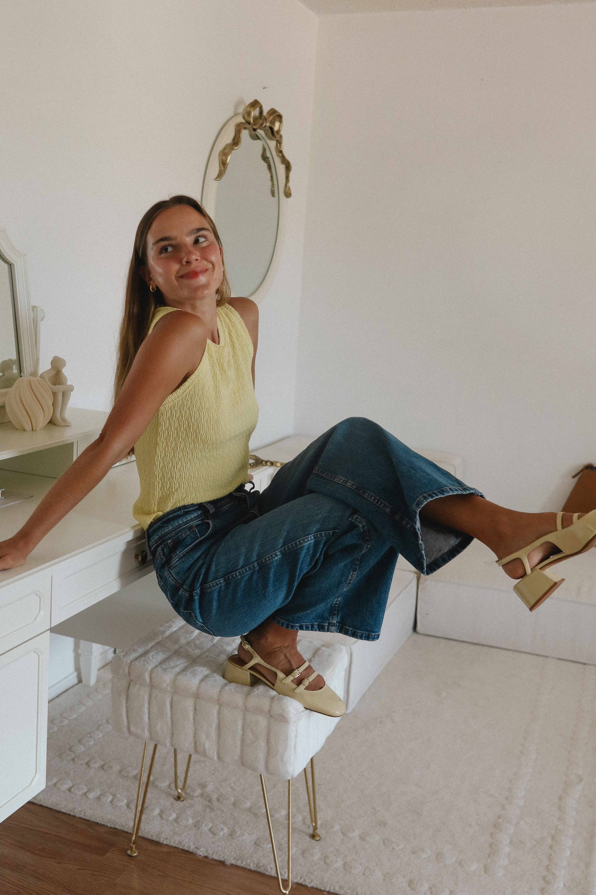 The vibrant yellow hue captures the essence of a Mediterranean summer, while the breathable knit fabric provides a comfortable, flattering fit. Its classic sleeveless silhouette makes it the perfect layering piece under a denim jacket or a standout on its own with your favorite high-waisted white linen pants