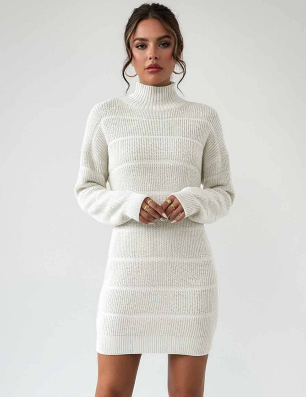 Meet your new cold-weather favorite — the Ribbed Knit Mock Neck Sweater Mini Dress. Designed in a soft, stretchy knit that hugs your curves just right, this dress combines cozy comfort with an elevated silhouette. The ribbed texture and mock neckline add a modern, polished touch, making it perfect for brunch dates, city strolls, or a night out.